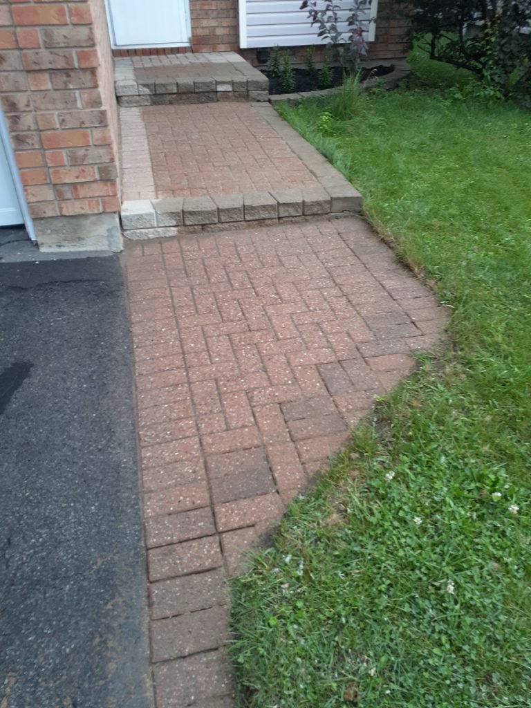 Решил починить крыльцо, так как поехали камни. Оказалось, что строитель их сделал просто криво. Мне пришлось даже резать камни, так как они были отрезаны специально криво. Лучше бы конечно, я не трогал это крыльцо. Заняло очень много времени выправить всё это дело. На фото ниже показано крыльцо, специально сделанное кривым.