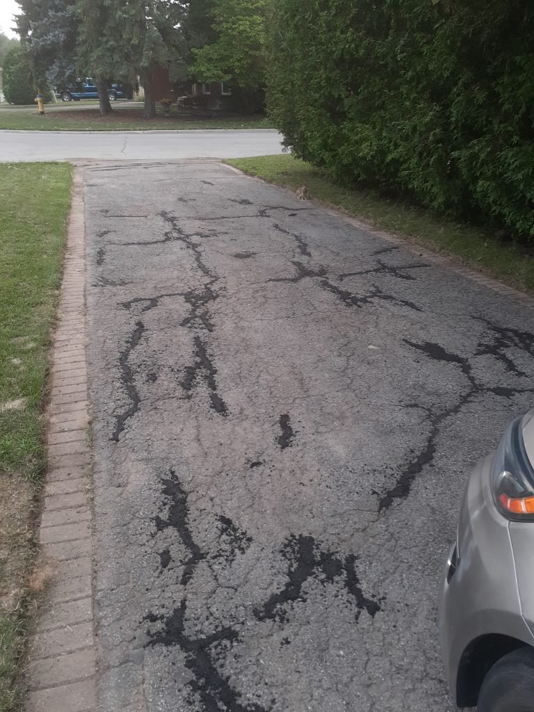 И в конце залили герметиком всю парковку. Мелкие трещины вблизи видны, но на расстоянии парковка как новая. Только асфальт местами просевший.